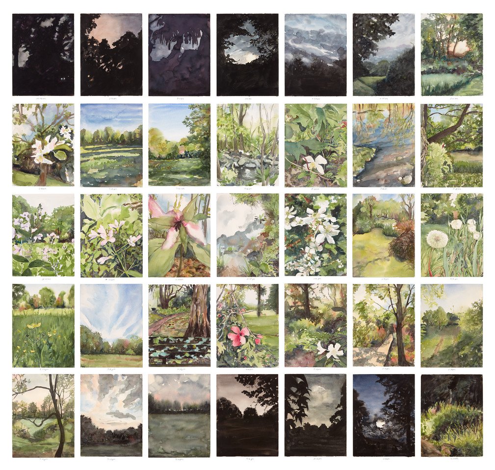 Cynthia MacCollum’s practice focuses on long-term, temporal and research-based installations with an ecological focus. A sense of place is fundamental to all of her work. Adopting a schematic approach, she employs forms of record-keeping as she tracks the passage of time, the migration of birds, the decline of native species, and the blooming of spring ephemerals. Recent solo exhibitions include It was Evening all Afternoon (2024) at MAPSpace in Port Chester, NY, and Thirteen Moon(2021) at the New Canaan Society for the Arts. Group shows include February(2025), Blue Print Gallery, Dallas, TX; Crit Ecologies: Artist, Community, Criticality(2024), Hudson Valley MOCA, Peeskill, NY; and When Darkness and Light are Blue and White(2024), Pearl Conrad Gallery, Ohio State University, Mansfield, OH. Her work is a form of intimate observance, using painting, collecting, and recording to adore and document her local natural spaces.