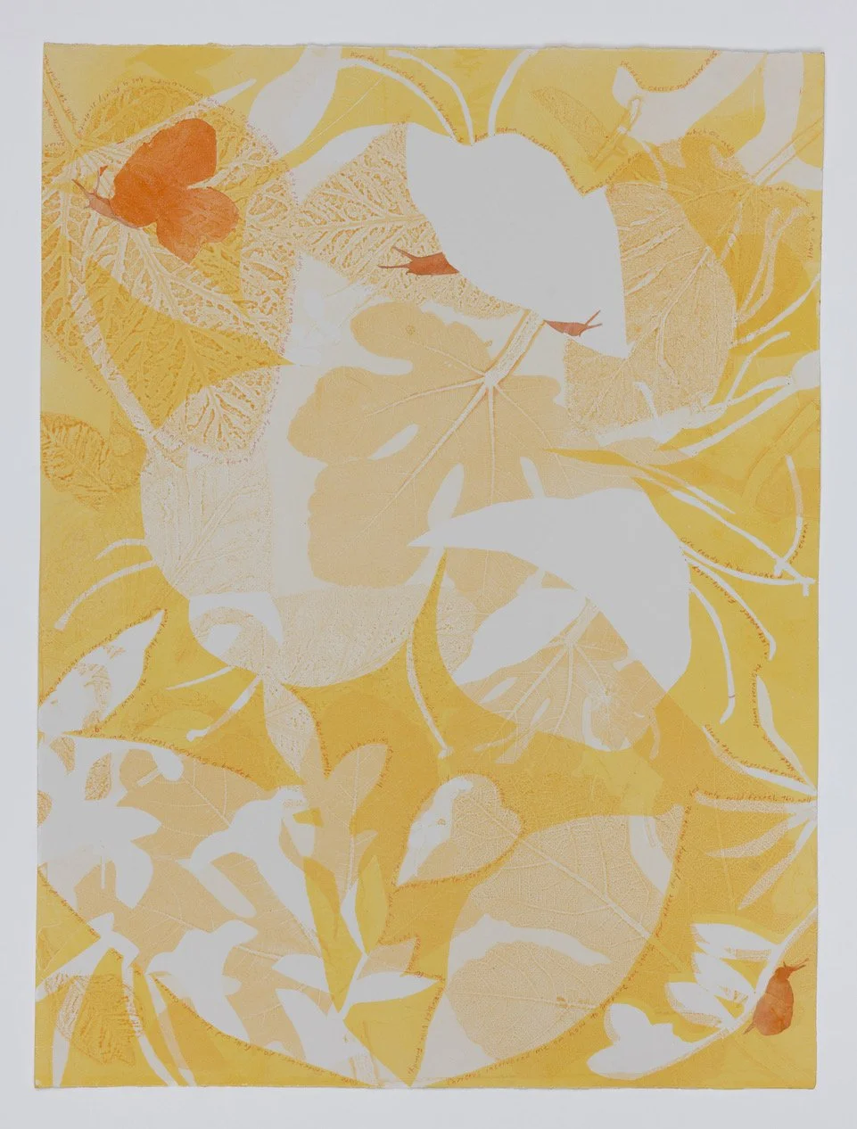 In September of 2025 MacCollum was a resident at the Skopelos Foundation for the Arts. There she created monotypes inspired by local flora and fauna, including Fig, Plumbago, Skopelos plums, Finnekas Palm, and Elm-leafed Blackberry. This work is also about her experience of being there: observing a Hummingbird Hawk-moth at the trumpet vine, spying a migrating group of bee-eaters, eating ripe figs straight from the tree.